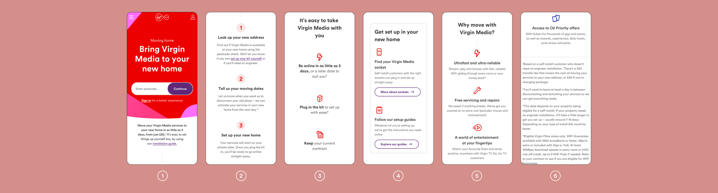 Above is the mobile landing page for Virgin Media home movers at the time of my coming to work on its overhaul. As you can see, despite the page being longer than six iPhone 13 mini screens, it fails to provide the user with meaningful information. Contentsquare data validated that the existing design failed to deliver value to the user. As a result, I set about trying to reduce marketing jargon and reduce the length of the page whilst simultaneously increasing how useful it’ll be for someone who would like to take their broadband with them when they move home.