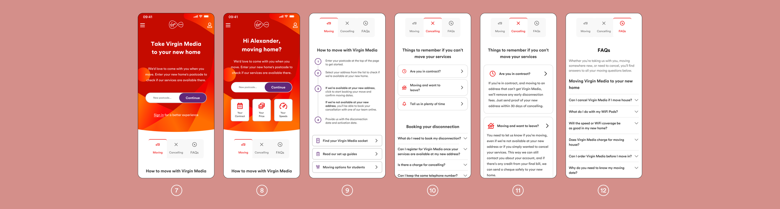 The page selector seen at the tops of screens 9-12 was created to combat the issues found across focus groups, user testing and Contentsquare. The main issues were the length of the page, the lack of useful information, and no clear guidance on how a contract can be ended. I learned that users strongly prioritise clarity and speed over jargon, and that the existing page design doesn’t help the user find key information. Seeing that only 40% of users clicked on the postcode checker, I moved from to a single flow of content to multiple flows that would prioritise certain tasks. Using a page selector to divide information into three separate groups reduces the amount of scrolling users are required to do, helping them to find information much more easily. Further reducing scrolling was done by making CTAs more compact. In both screens 4 and 9 you can see users are able to find information regarding wall sockets and a set up guide, however one takes up a full screen and the other takes up only a quarter. Having a dedicated cancelling page allows users to feel safe in the fact that they can leave Virgin Media without repercussions. It’s very easy to build resentment towards a company that employs sneaky tactics to get you to stay, but I believe every user should be able to easily navigate any website regardless of their intentions.