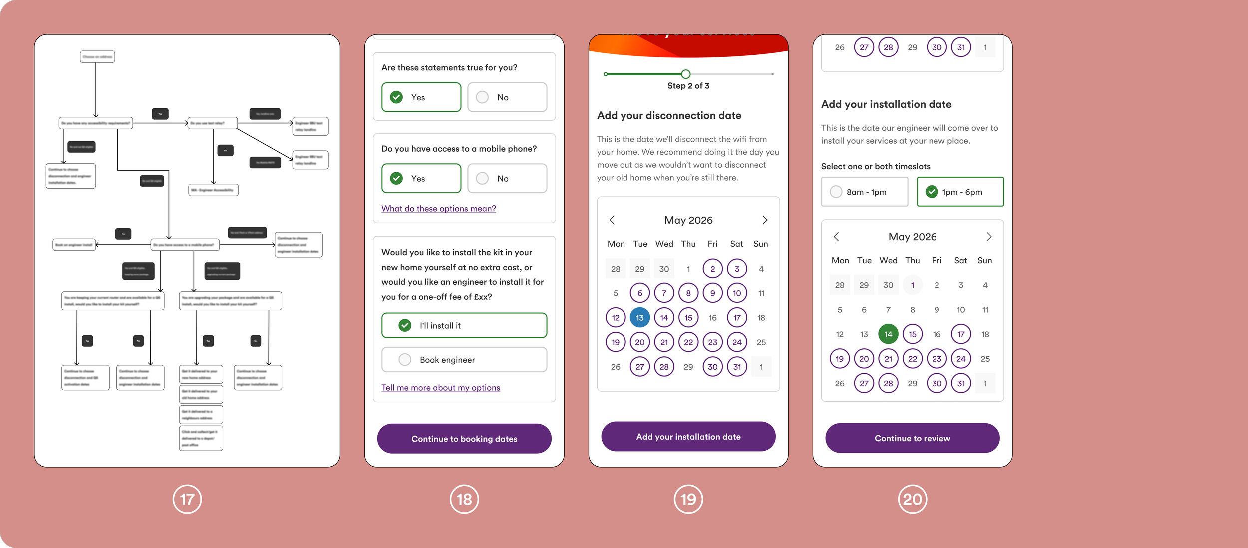To enable all customers to book their move autonomously, the flow needed to be restructured. I introduced an initial set of questions designed to determine whether a customer could complete a self-install or would require an engineer. Based on their responses, users were either guided through the appropriate self-serve journey or directed to a tailored flow for engineer installation. I consolidated the previously separate disconnection and activation date pages into a single screen, allowing users to easily scroll between and compare the two dates. The disconnection date calendar is first presented to the customer, and once a date has been selected and the ‘add your installation date button’ pressed the page automatically scrolls down to reveal a new calendar. This means that the customer is guided through the journey and reduces confusion between the two calendars. To further reduce errors and cognitive load, the disconnection date was styled in blue and the activation date in green, making each state immediately distinguishable. The disconnection date initially became red when selected, but user testing showed this was mistaken as an error message, and caused confusion, and hence was changed.