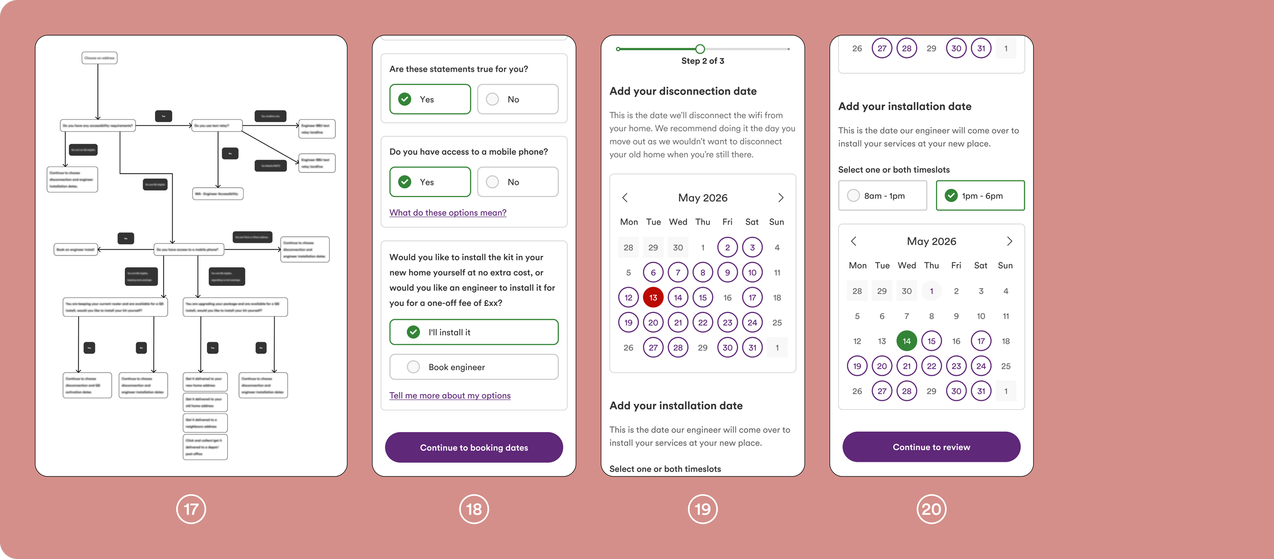 To enable all customers to book their move autonomously, the flow needed to be restructured. I introduced an initial set of questions designed to determine whether a customer could complete a self-install or would require an engineer. Based on their responses, users were either guided through the appropriate self-serve journey or directed to a tailored flow for engineer installation. I consolidated the previously separate disconnection and activation date pages into a single screen, allowing users to easily scroll between and compare the two dates. To further reduce errors and cognitive load, the disconnection date was styled in red and the activation date in green, making each state immediately distinguishable.