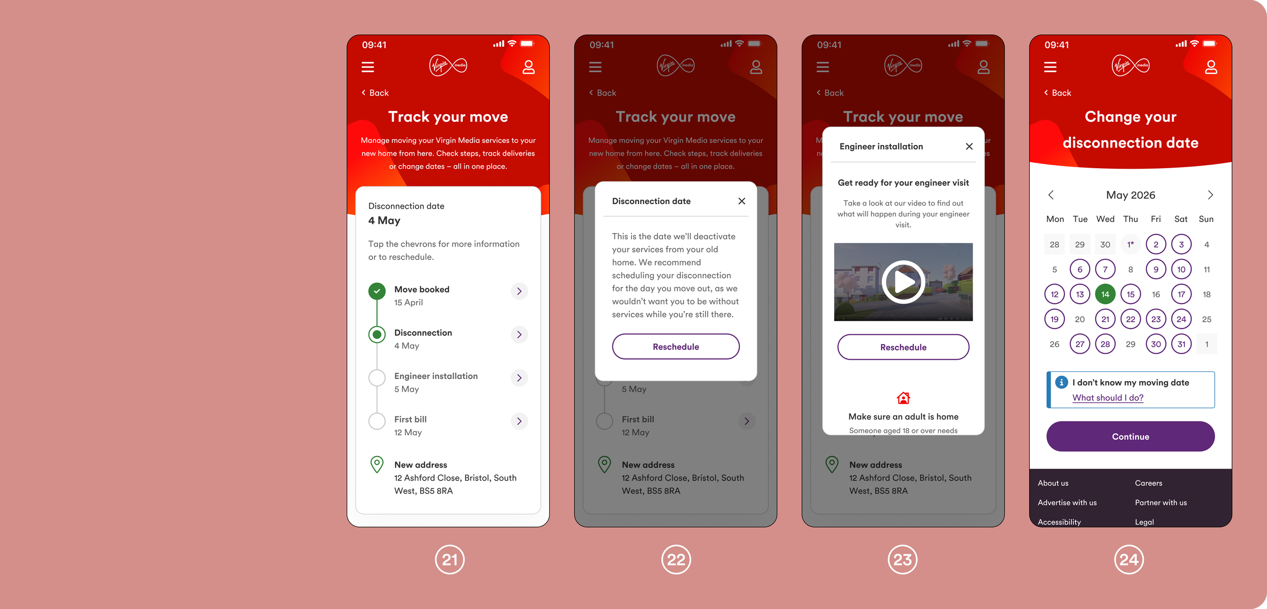 From the timeline (screen 21), customers can reschedule key stages of their move. Selecting ‘reschedule’ takes the user to a dedicated page (screen 24), with a similar experience provided for rescheduling an engineer installation.