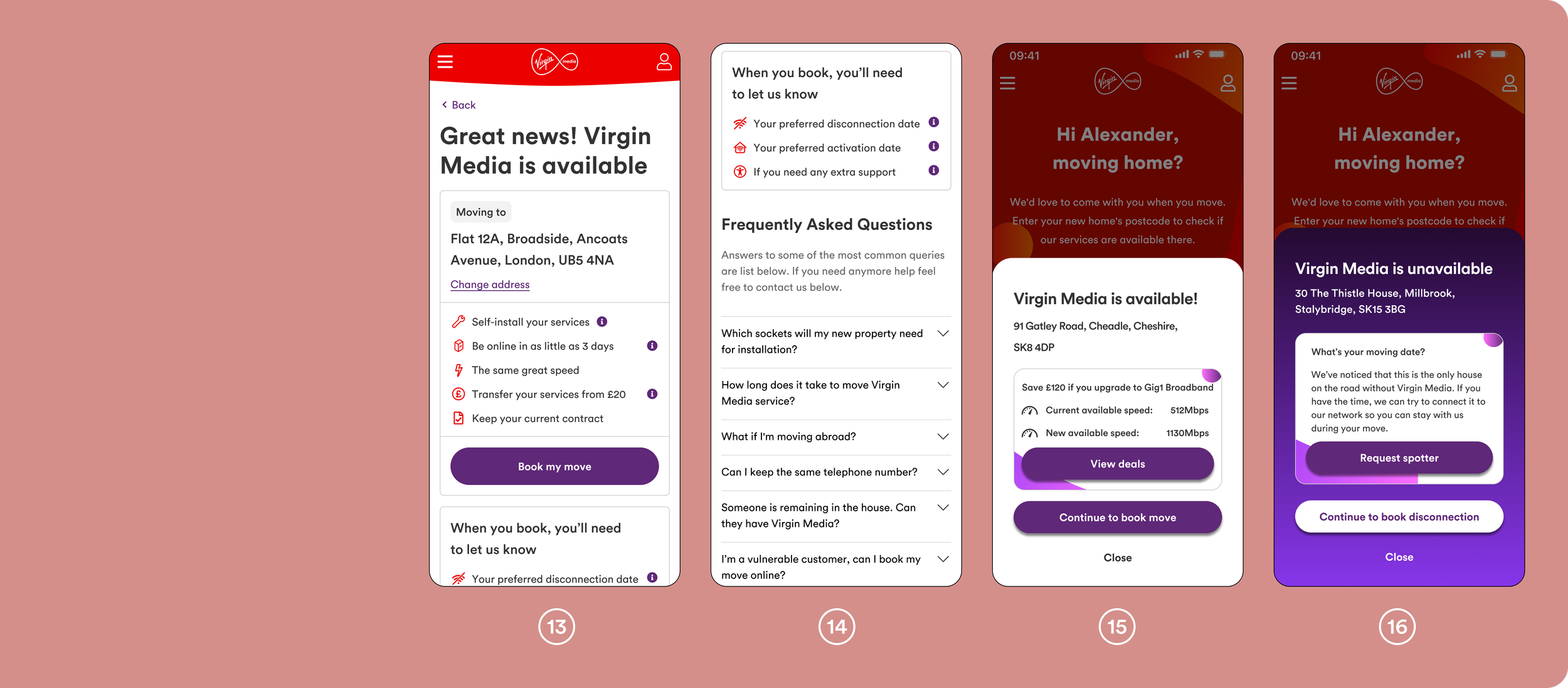 When customers with an active Virgin Media contract move home, they use the Home Movers journey to check service availability at their new address and manage their move or disconnection. The journey helps with two key scenarios: transferring service to a new property or cancelling if Virgin Media is unavailable. In both cases, customers should be able to self-serve by selecting their disconnection and activation dates, or choose a cancellation date if they’re leaving.